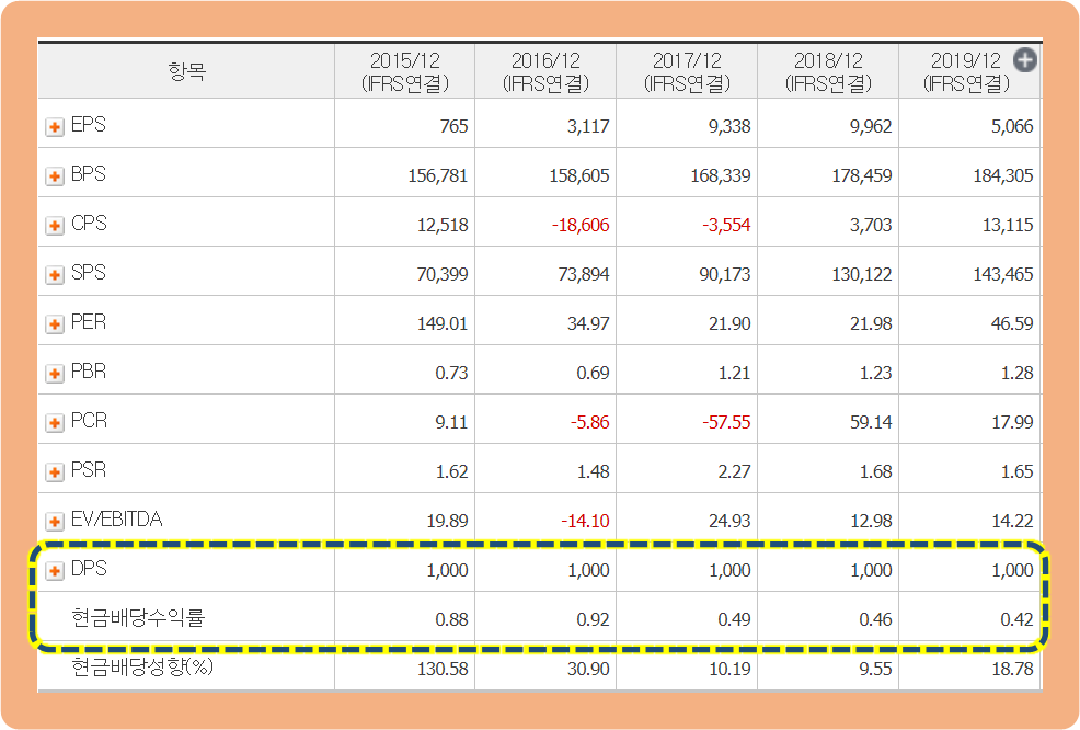 2015년도부터 꾸준히 1주당 배당금을 1,000원씩 지급하고 있습니다.