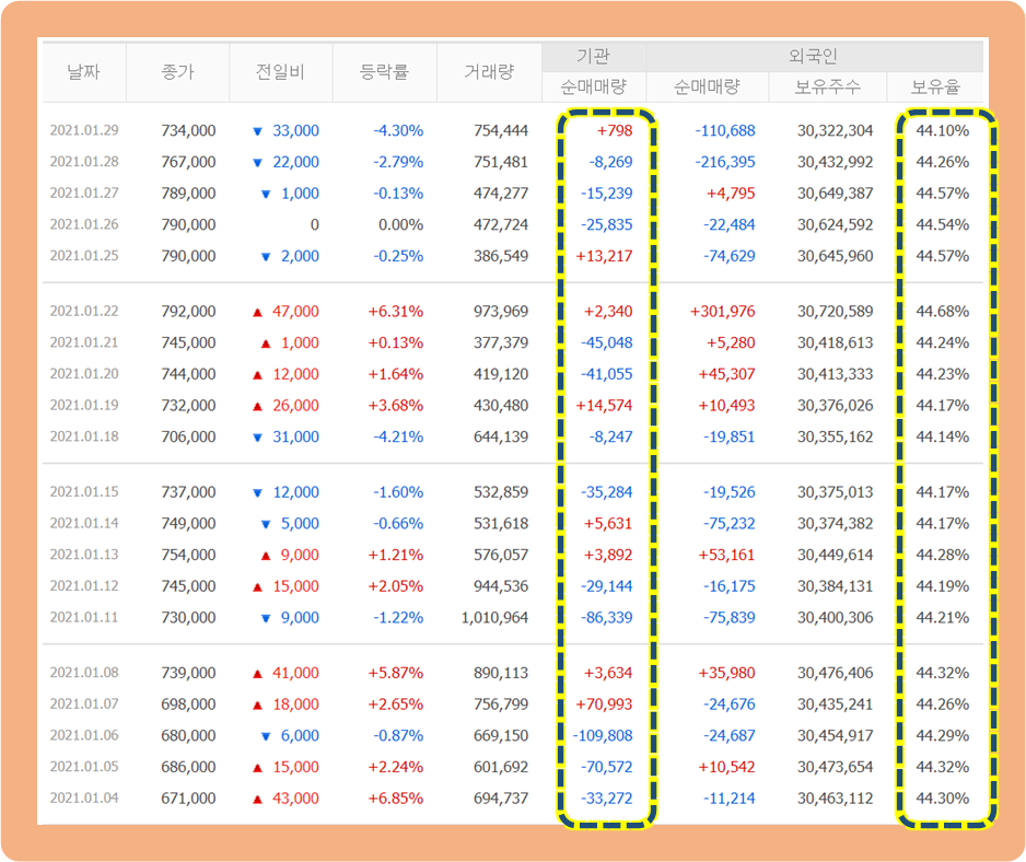 그리고 외국인 투자자들의 지분율은 44%대를 유지하고 있네요.