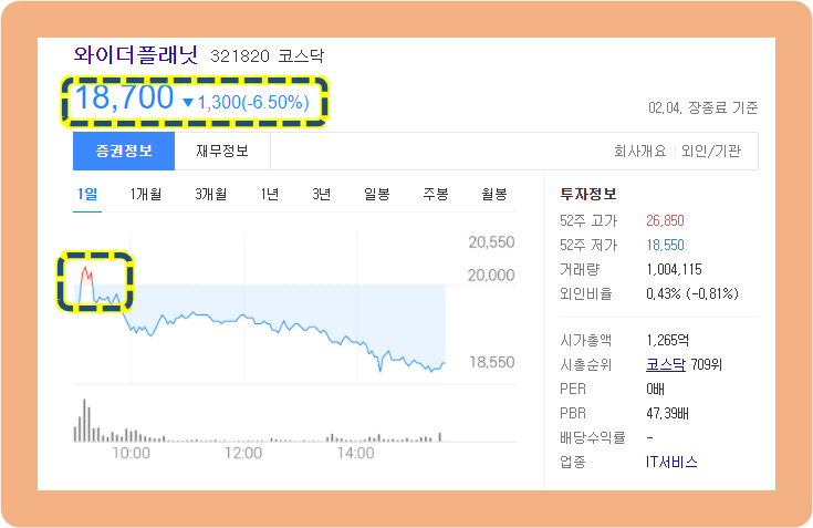 와이더플래닛이 코스닥에 상장한 첫 날인 2월 3일, 시초가는 공모가였던 16,000원보다 8,900원 높은 24,900원으로 시초가 출발을 했는데요.