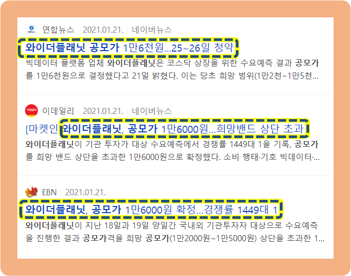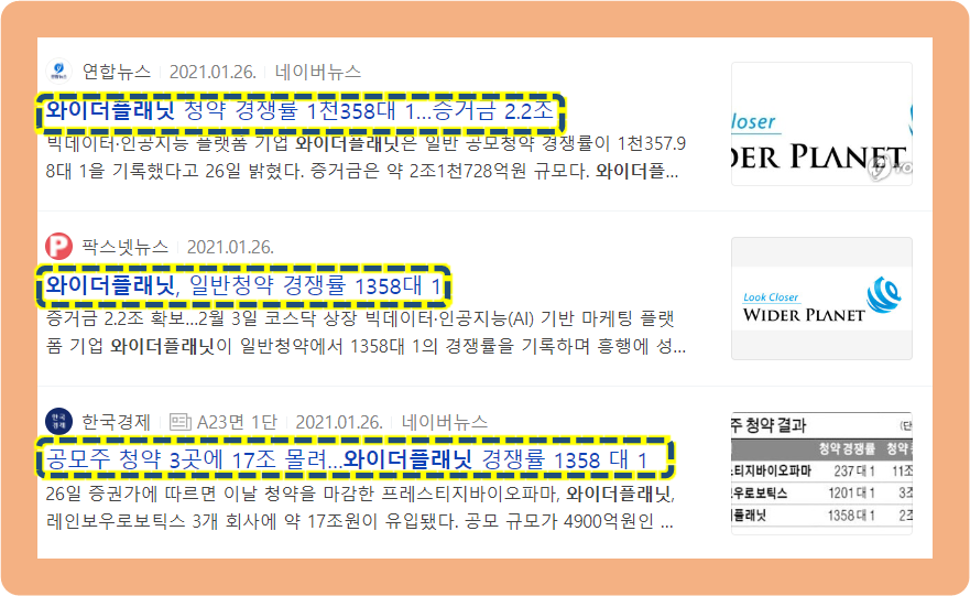 그리고 며칠 후인 2021년 1월 25~6일에 진행된 와이더플래닛의 일반 공모 청약 경쟁률은 1,358 :1을 기록했습니다.