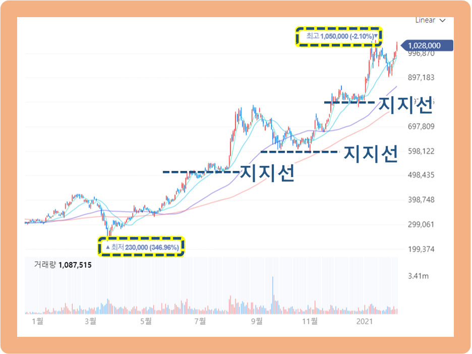 최근 2021년 1월 14일에는, 최저점 대비 약 4배 이상 높은 1,050,000원까지도 상승했었네요.