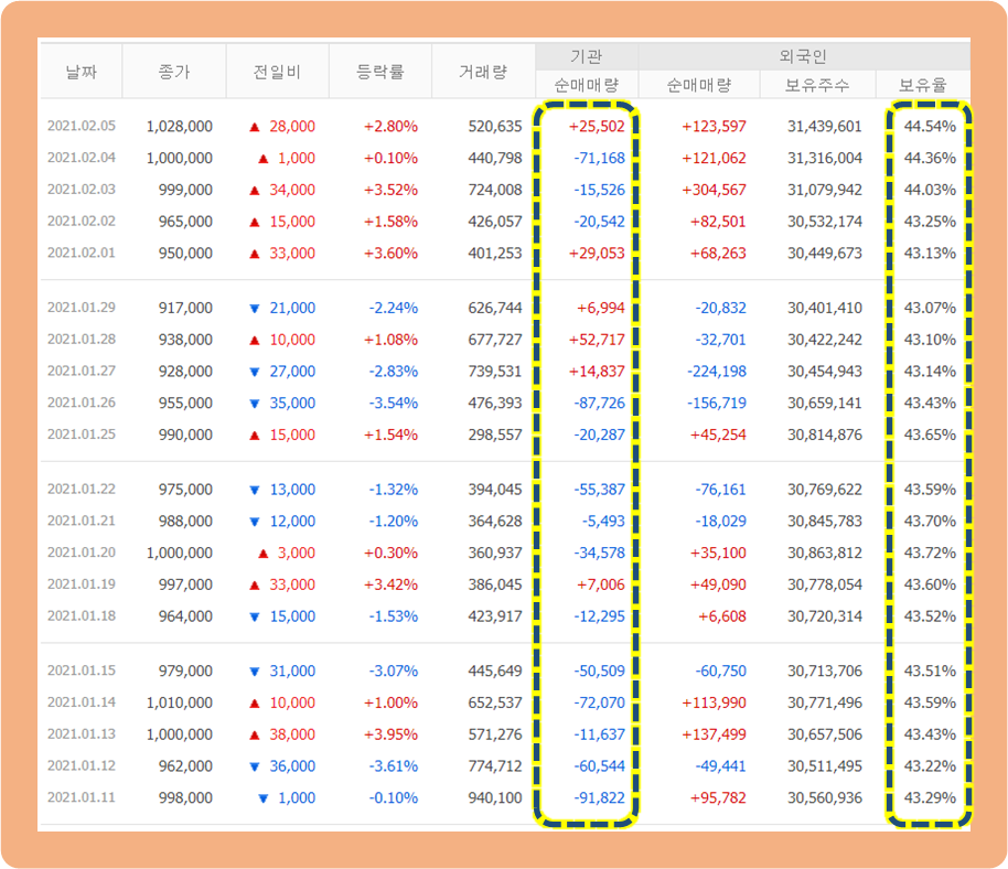 10년 동안 주식 가격 중에서, 2015년 1월에 163,000원이 최저점이였고 2021년 1월에 1,050,000원을 터치하면서 10년 중 가장 높은 주가를 갱신했습니다.