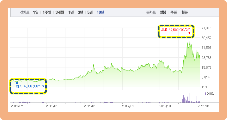 오히려 2020년 3월부터 주가가 급등하기 시작하더니, 2020년 7월 21일에는 최고점 42,537원을 터치했습니다.