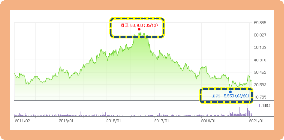 지난 10년 동안 가장 높았던 주가는 2016년 5월 13일에 기록한 63,700원이였는데요.