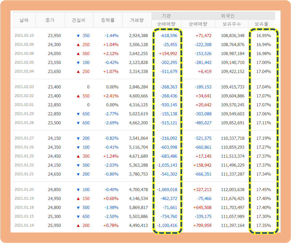 기관투자자는 죄다 파란불이 켜있네요. 매도세가 엄청 강한 모습입니다.