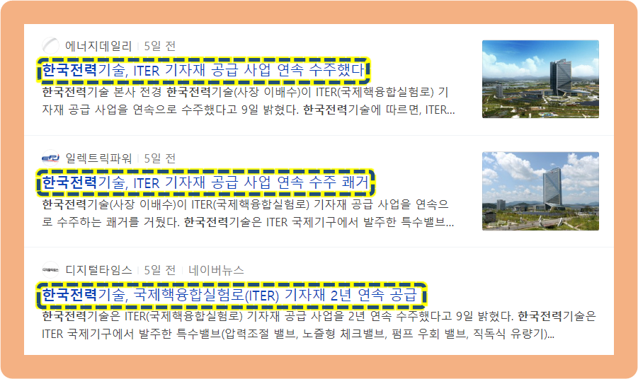 그리고 2021년 2월 9일에는 한국전력의 자회사인 한국전력기술이 ITER(국제핵융합실험로)의 기자재 공급 사업을 2년 연속 수주에 성공했습니다.