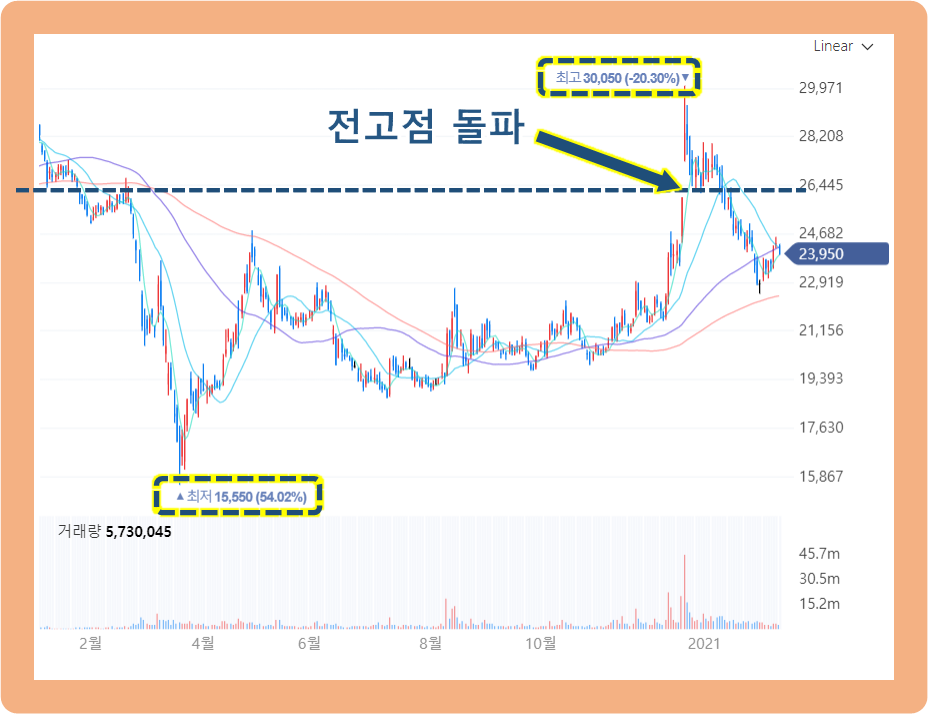 이후 등락을 반복하다가 2020년 12월부터 주가가 급등하기 시작하더니, 전고점을 돌파하면서 최고 30,050원까지 상승했습니다.