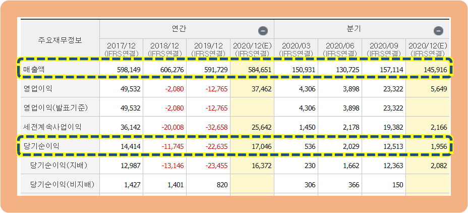 그리고 연간 당기순이익은 2018년, 2019년 2년 연속 적자를 기록했었는데요.
