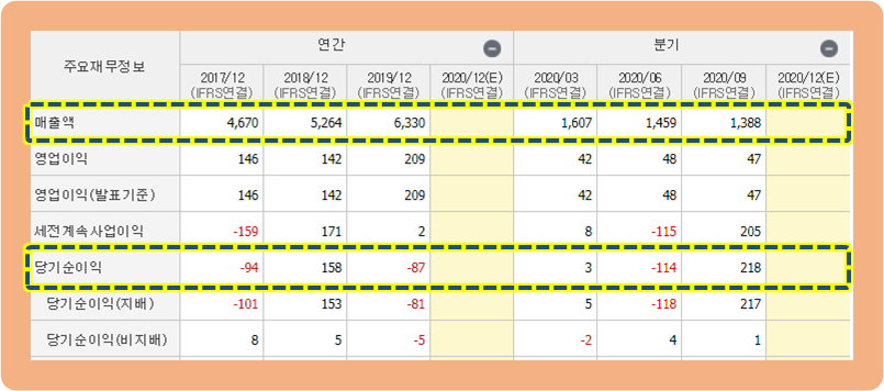 2020년도 1~3분기까지의 당기순이익 합은 107억원으로, 4분기까지의 실적이 더해지면 2020년도 연간 순이익은 흑자를 기록할 것으로 예상되네요.