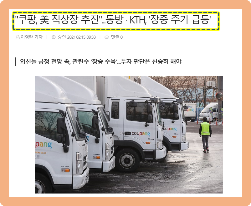 쿠팡이 미국 뉴욕 증시에 상장된다는 소식이 발표된 후 시장가치 기대를 전망해서 쿠팡 관련주인 동방이 수혜를 받으며 주가가 급등했습니다.