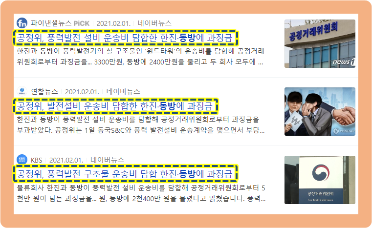 2021년 2월 1일, 동방과 한진이 풍력발전기의 구조물인 윈드타워의 운송비를 담합한 이력이 있는데요.