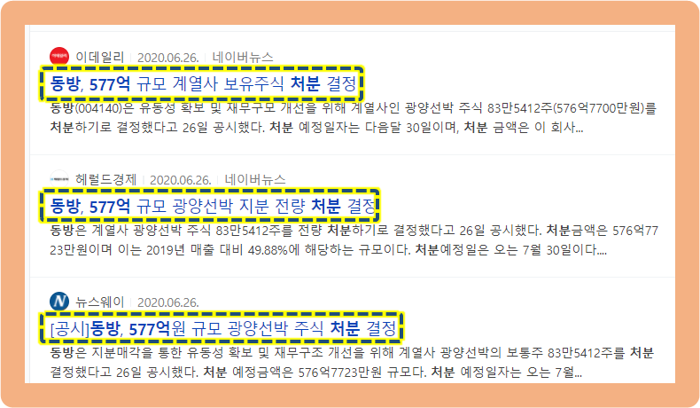 2020년 6월 26일에는 동방이 계열사인 광양선박의 주식 83만5,412주를 처분하기로 결정했습니다.