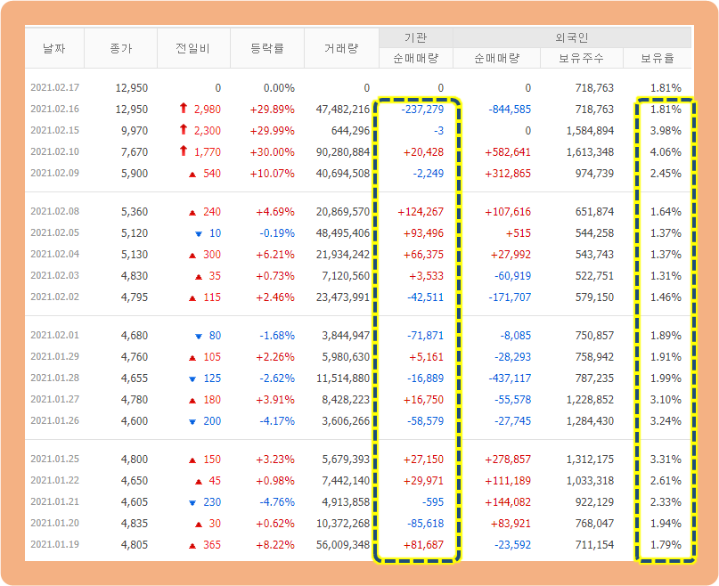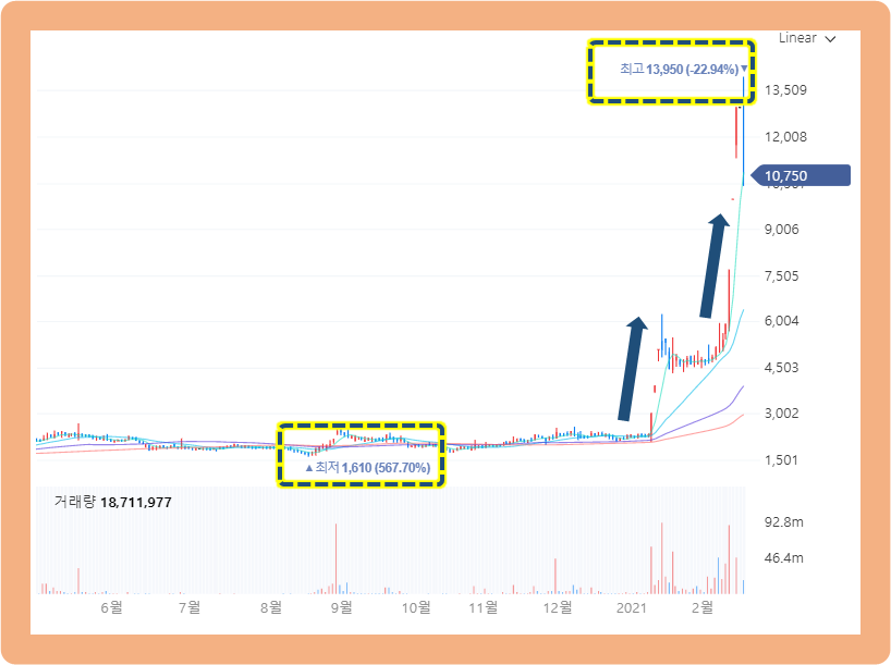 이후 약 한 달 동안 다시 횡보를 하다가 2월부터 2차 급등을 하면서 2021년 2월 18일에는 13,950원까지 상승한 상황입니다.