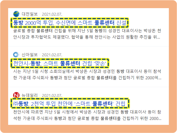2021년 2월 7일, 동방이 올해부터 2022년 12월까지 약 2,000억원을 투입해 천안시에 약 17만 제곱미터 규모의 물류센터를 건립한다고 발표했습니다.