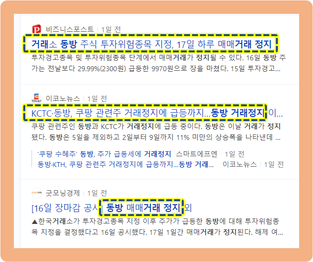 동방이 증권시장에 상장된 후 처음으로 투자위험종목에 지정되면서 2021월 2월 17일 하루 거래가 정지되었습니다.