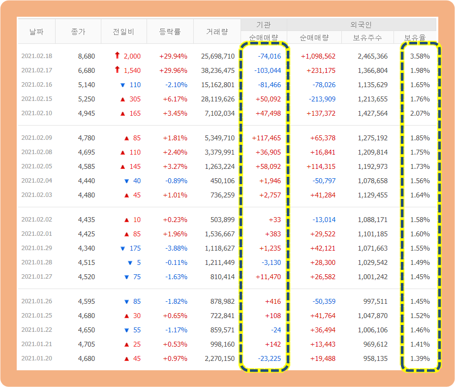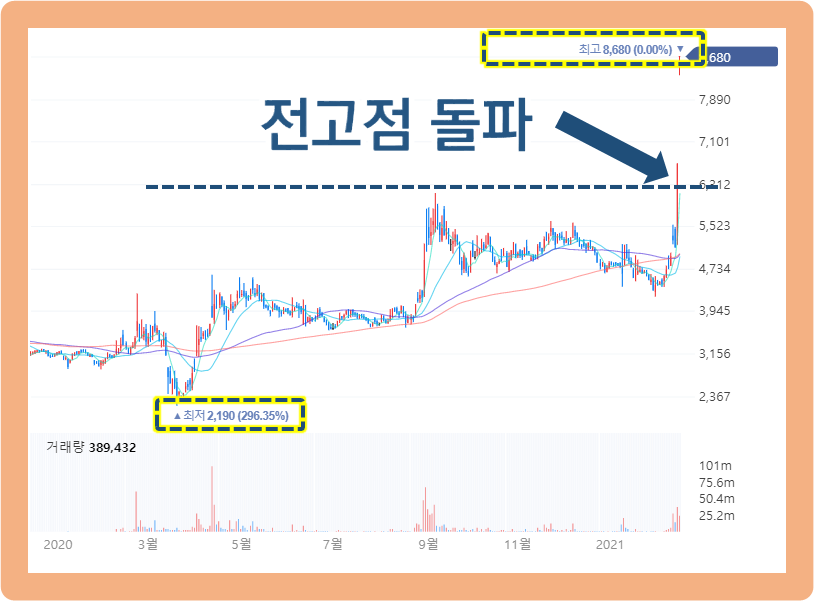 그러던 중 2021년 2월 17일부터 비트코인 페이코인과 쿠팡 호재로 상한가를 치면서 전고점을 돌파한 상황입니다.