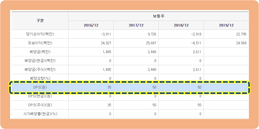 2016년 : 35원, 2017년, 2018년 : 50원을 지급해줬는데, 2019년도에는 순이익도 상승했는데 오히려 배당금을 지급해주지 않았네요.
