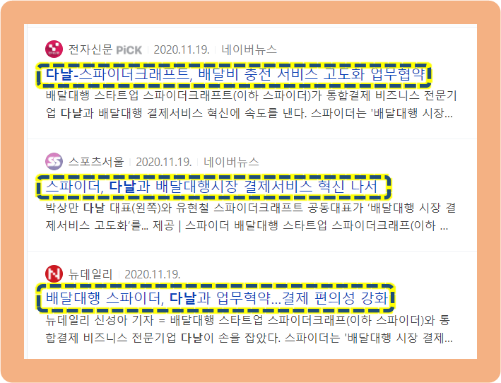 그리고 약 2주뒤인 2020년 11월 19일에는 다날이 배댈대행 스타트업체인 스파이더크래프트와 업무협약을 체결했는데요.
