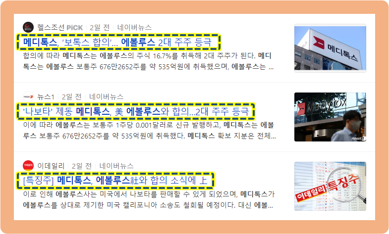 2021년 2월 22일 메디톡스가 대웅제약의 보툴리눔 톡신 '나보타'의 미국 파트너 회사인 에볼루스의 주식 16.7%를 취득하여 2대 주주가 되었다고 합니다.