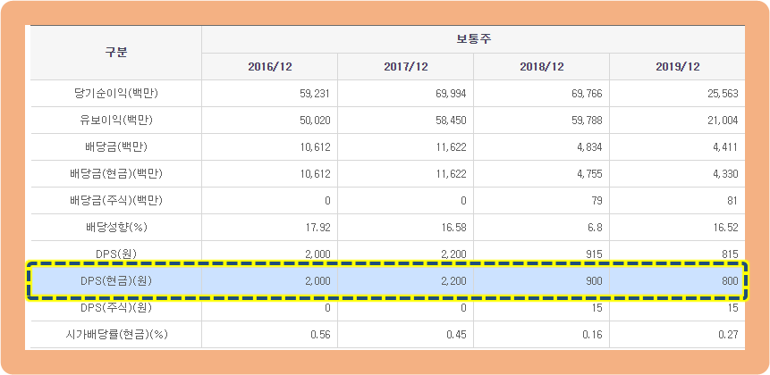 2016년 : 2,000원 / 2017년 : 2,200원 / 2018년 : 900원 / 2019년 : 800원으로 아쉽게도 배당금액이 줄어들고 있는 상황입니다.