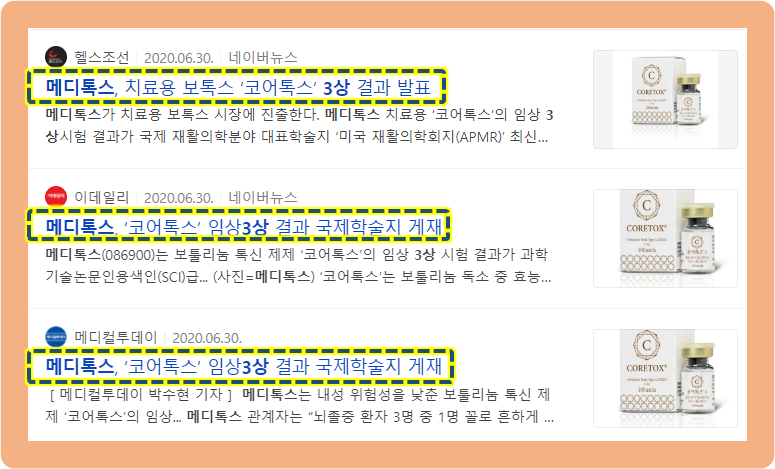 2020년 6월 30일, 메디톡스의 보툴리눔 톡신 제제인 '코어톡스'의 임상 3상 결과가 과확기술논문인용색인급의 국제 재활의학 분야 대표학술지인 '미국재활의학회지' 최신 호에 게재되었습니다.