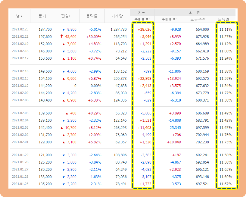 지난 한 달 간 기관 및 외인 주식 투자 동향