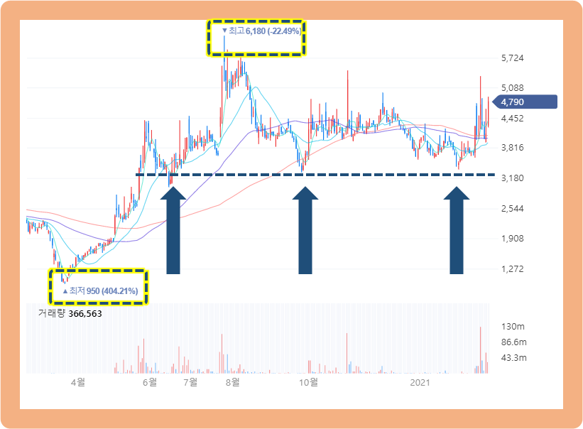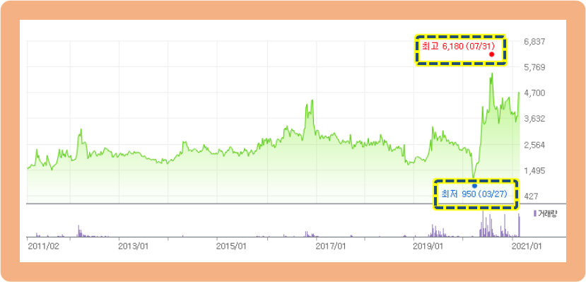 그리고 2020년 7월 27일, 최고점 6,180원까지 상승한 뒤, 지금은 어느정도 숨고르기를 하고 있는 것으로 보여지는데요.