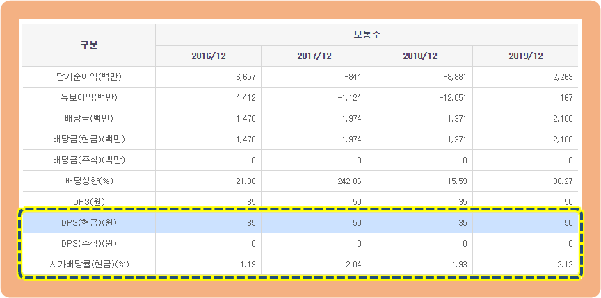 2016년 : 35원, 2017년 : 50원, 2018년 : 35원, 2019년 : 50원을 지급해줬습니다.