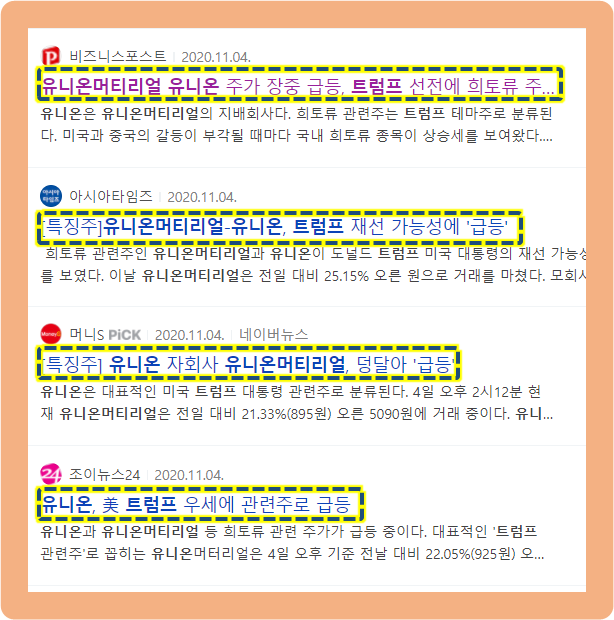 2020년 11월 4일, 미국 대선 개표에서 트럼프 대통령이 예상보다 선전한 것으로 알려지면서 희토류 관련주인 유니온머티리얼 주가도 25% 상승하며 장을 마감했습니다.