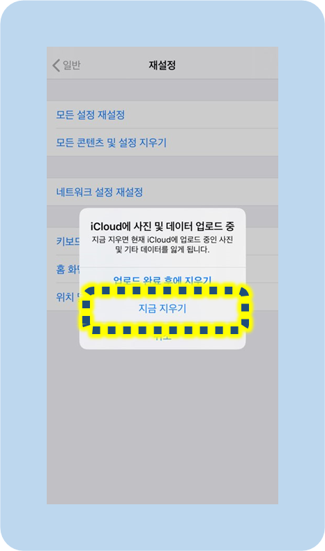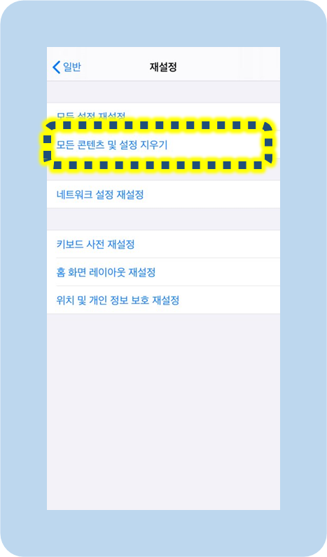 모든 콘텐츠 및 설정 지우기를 클릭해주세요