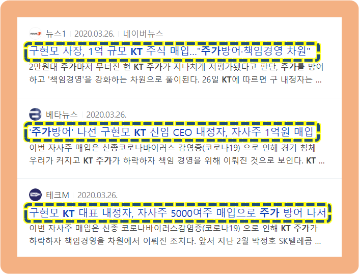 총 5,234주를 매수한 것인데요. 코로나 팬데믹으로 인한 KT 주가가 하락하자 주가 방어 및 책임 경영을 위한 것이라고 합니다.