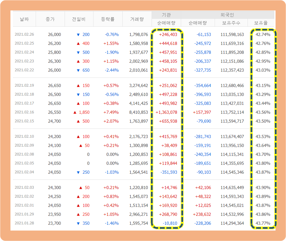 기관투자자는 매수세가 엄청 강하게 들어오고 있는 모습입니다. 최근 주가 상승은 보이고 있지 않은데, 기관은 꾸준히 매집하고 있네요.