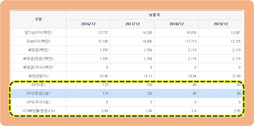 그리고 2020년 기준으로는 전년도와 같은 1주당 80원 배당을 실시할 예정이라고 합니다.