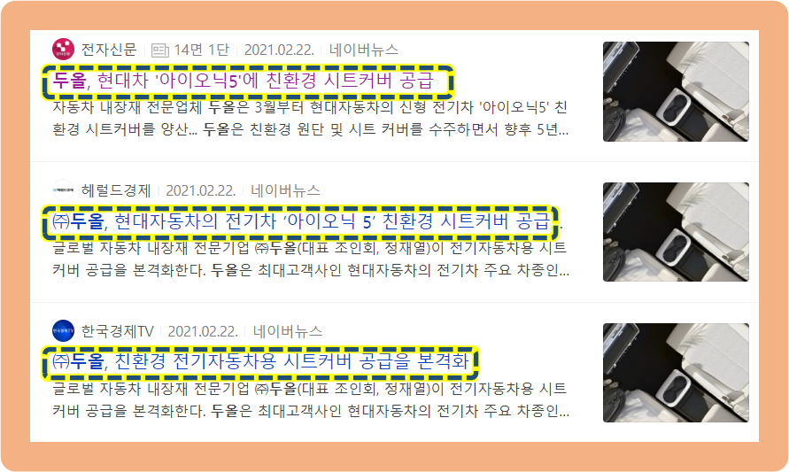 이에 따라, 자동차 내장제 전문 기업인 두올이 아이오닉5에 친환경 시트커버를 공급한다는 호재로 인해 상한가를 기록한 것이구요.