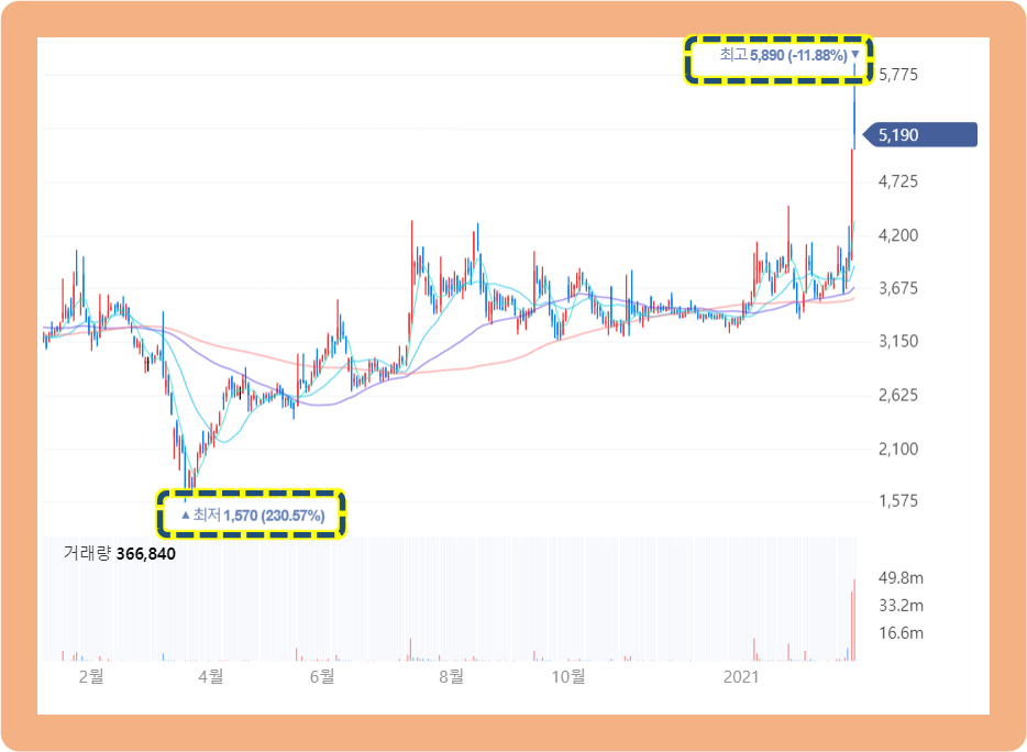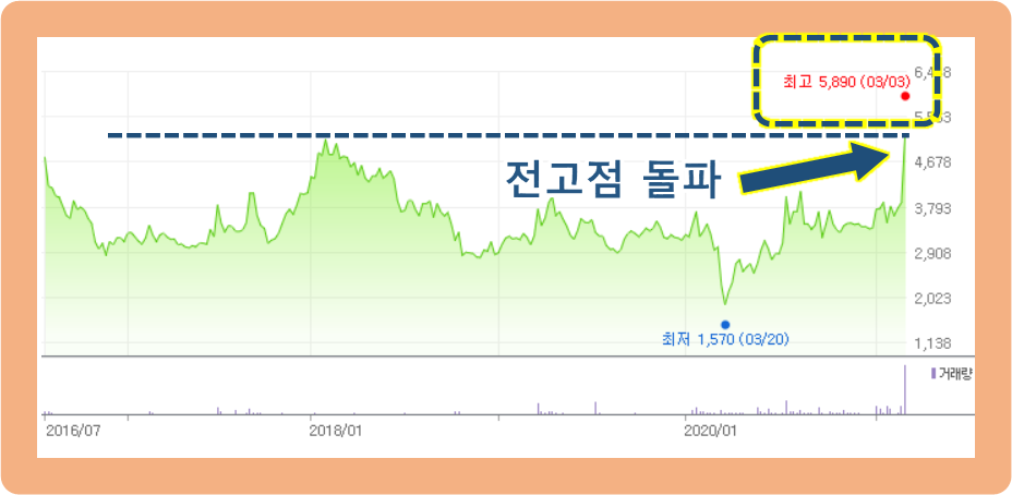 계속 등락을 반복하다가 2020년 3월 2일 아이오닉5 완판 소식에 상한가를 기록하며 5,040원까지 상승했고, 그 다음 날인 3월 3일에도 상승세를 이어가면서 5,890원까지 터치한 상황입니다.