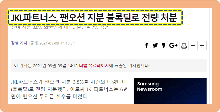 여기서 JKL파트너스는 2017년도에 블록딜(시간외 대량매매)을 진행하여 투자금 일부를 회수했었구요.