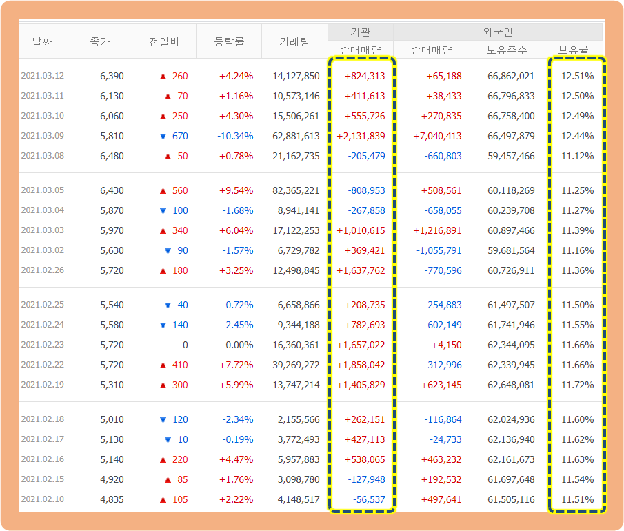 기관, 외인 모두 꾸준히 매집하고 있는 상황이네요.