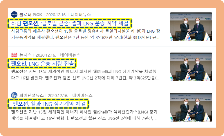 2020년 12월 15일 팬오션은 글로벌 정유회사인 셸과 LNG 장기계약을 체결했습니다.
