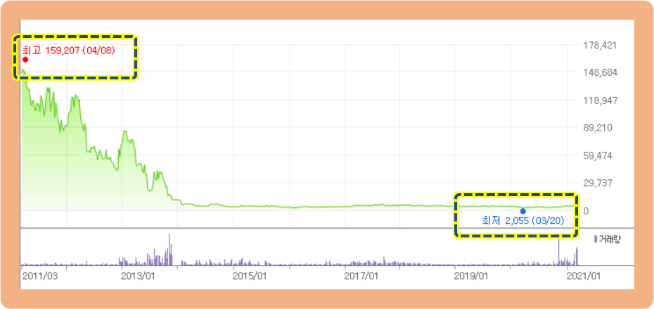 지난 10년동안 팬오션 주가 추이를 보시면, 10년전엔 약 16만원 수준이였습니다.