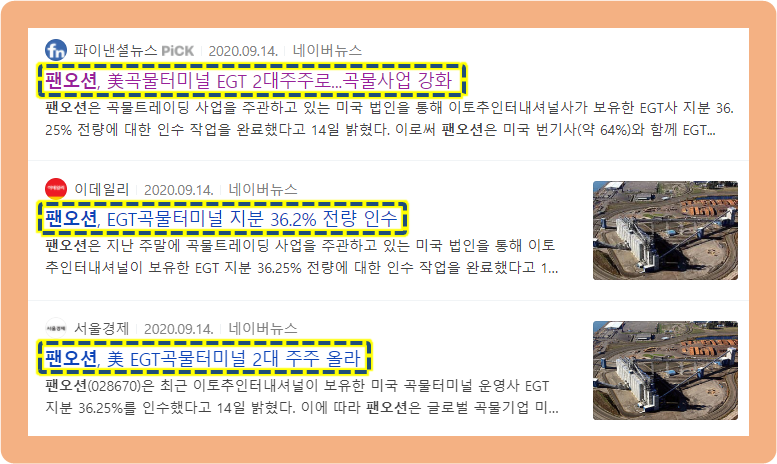2020년 9월에는 팬오션이 이토추인터네셔널이 보유하고 있는 미국 곡물터미널 운영서 EGT의 지분을 36.25% 인수했다고 하는데요.