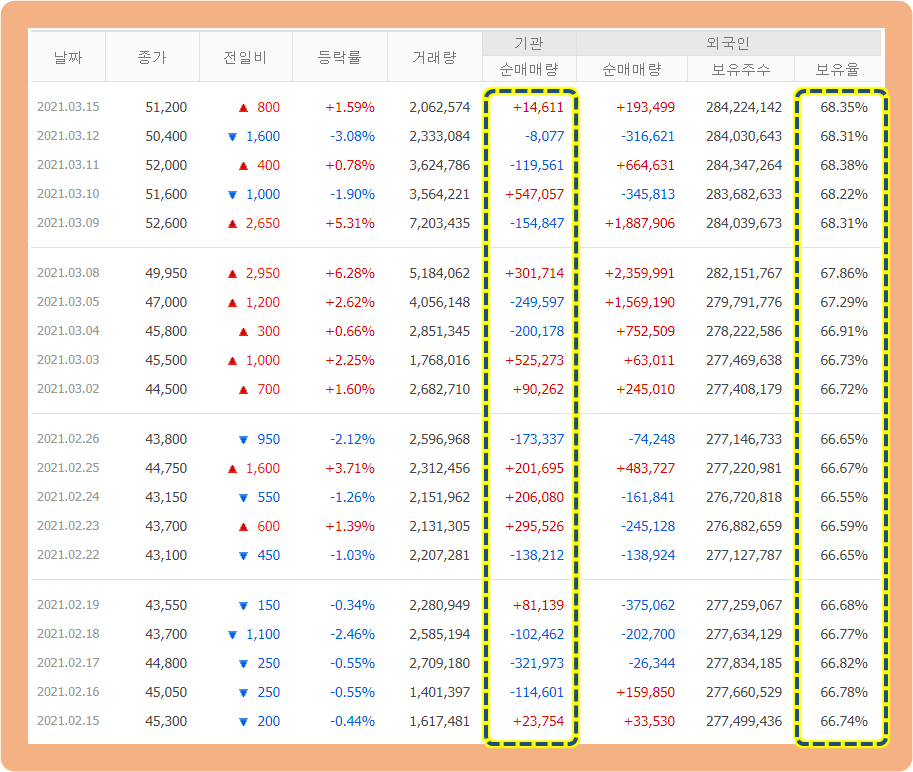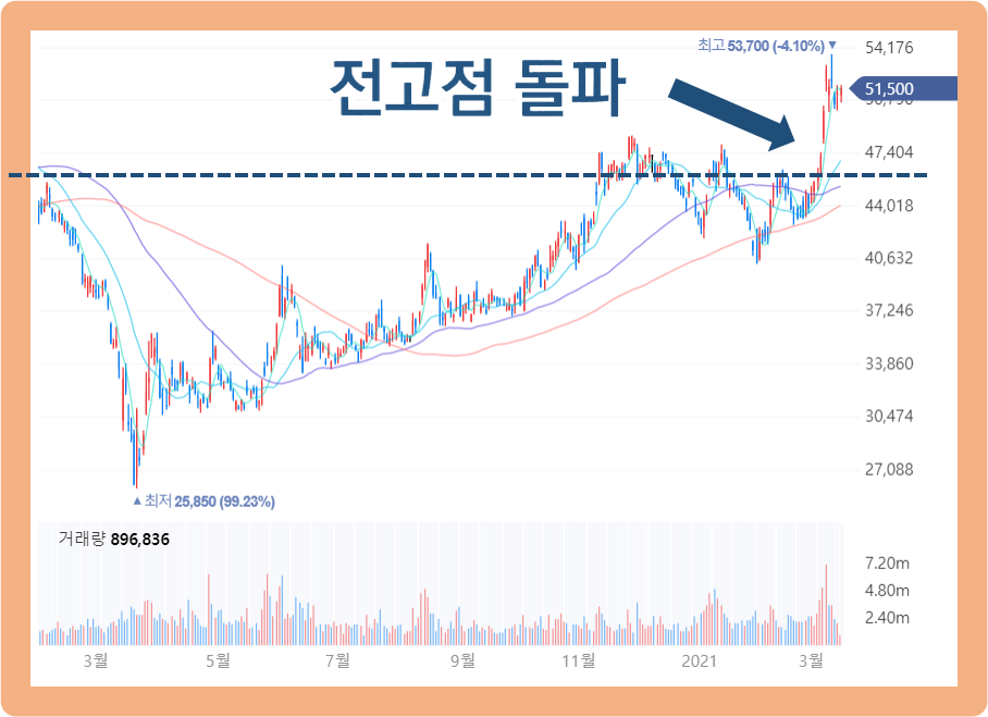 그리고 코로나 하락 사태로부터 약 1년 뒤인 2021년 3월경, 코로나 직전 전고점을 돌파하였고 2021년 3월 11일에는 최고점 53,700원까지 기록한 상황입니다.