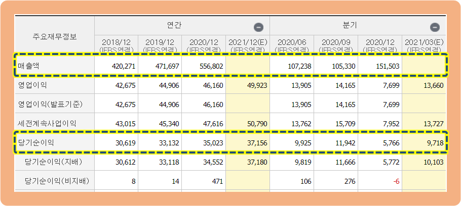 당기순이익도 위에서 말씀드렸듯이 2020년 기준으로 35억원을 기록하면서 사상 최대 실적을 내줬습니다.