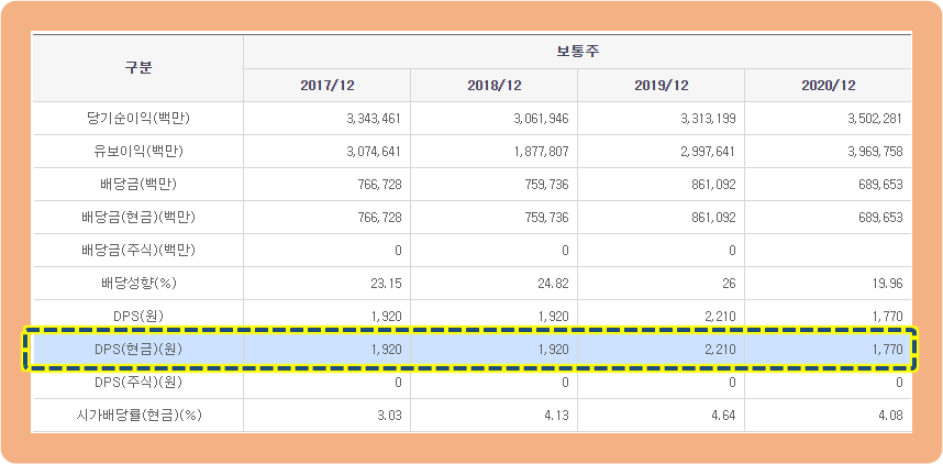 2020년 기준으로 사상 최대 실적을 내었지만, 배당금 지급은 전년도 대비 감소하였는데요.