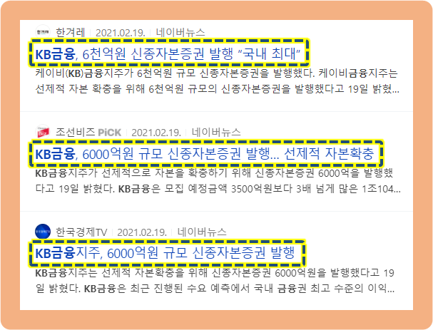 2021년 2월 19일경에는 KB금융이 약 6,000억원 규모의 신종자본증권을 발행했습니다.