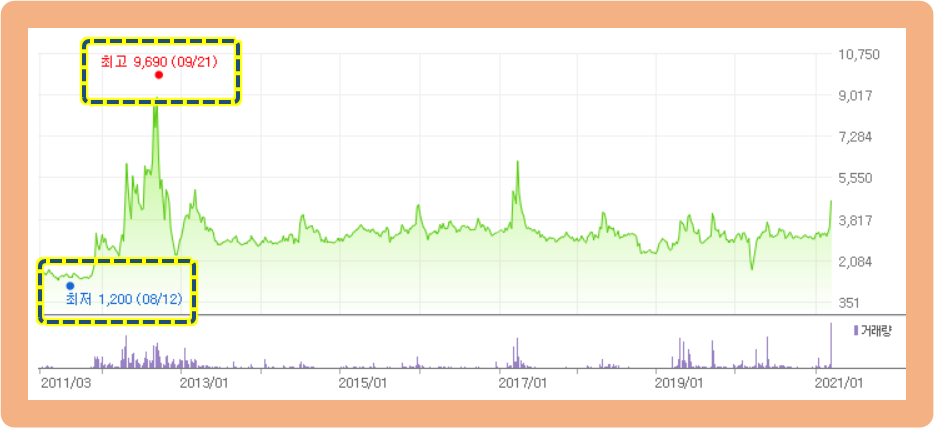 최저점은 2011년 8월 12일에 기록한 1,200원이구요. 최고점은 2012년 9월 21일에 기록한 9,690원으로 약 8배 정도 차이 나네요.