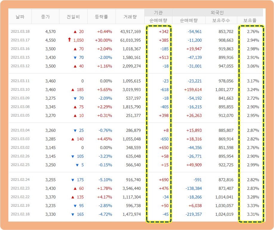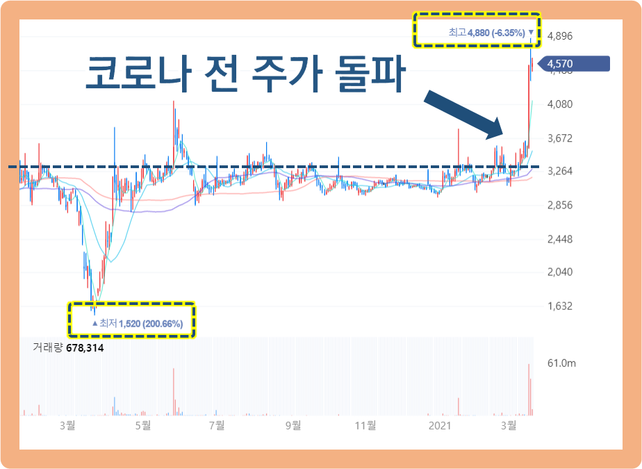 그러다가 2021년 3월 16일부터 주가가 갑자기 급등하기 시작하더니, 코로나 전 주가를 제대로 돌파하면서 2021년 3월 18일에는 최고 4,880원까지 기록한 상황입니다.