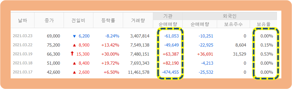 그리고 5거래일째인 3월 23일에는 전 날 대비 하락한 69,000원에 장을 마감하면서, 다소 조정을 받고 있는 것으로 보입니다.