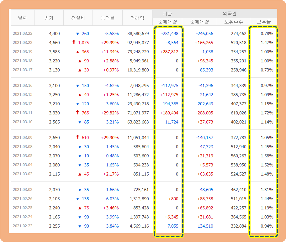 기관투자자의 거래량은 최근들어 늘어난 모습이네요. 매수세와 매도세가 균형을 이루고 있습니다.