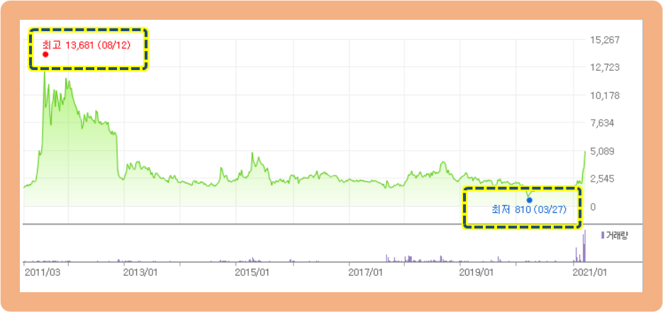 최저점 800원과 비교하면, 무려 6배 넘게 오른 것이죠.
