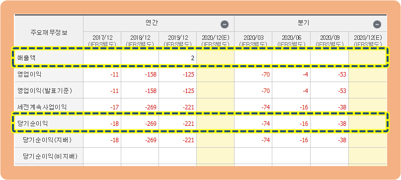 그리고 연간 당기순이익은 2017년도 -18억원 적자였는데, 2018년도와 2019년도에는 -200억원대 손실을 기록하면서 적자 폭이 더 커지고 있습니다.